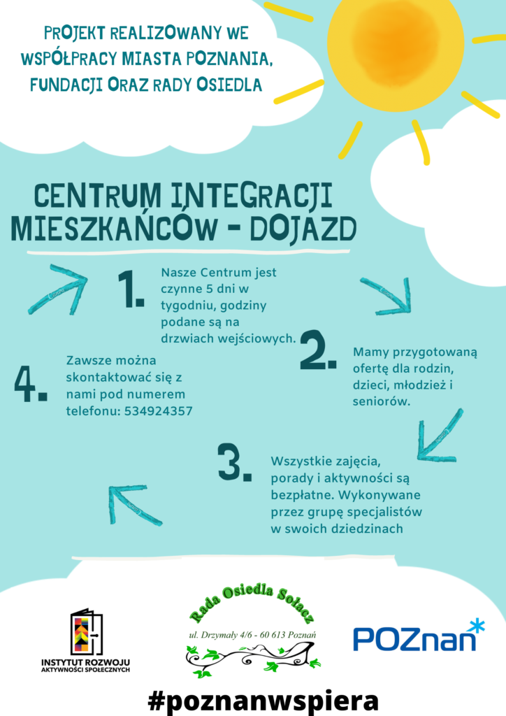 Zarząd Komunalnych Zasobów Lokalowych w Poznaniu – dzięki zasobom finansowym ZKZL wyremontowany i oddany w najem jest lokal przy ul. Dojazd, w którym możemy realizować zajęcia oraz przyjmować mieszkańców. To lokalne miejsce ma być dla mieszkańców najbliższej okolicy centralnym punktem korzystania z pomocy, animacji i integracji.