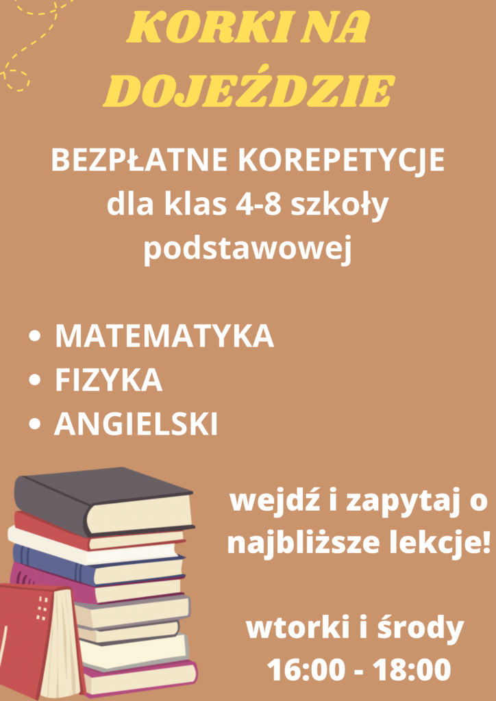 Młodzież klas 4-8 szkół podstawowych zapraszamy na korepetycje z matematyki, angielskiego czy polskiego w każdy wtorek w godzinach 16:00 – 18:00.